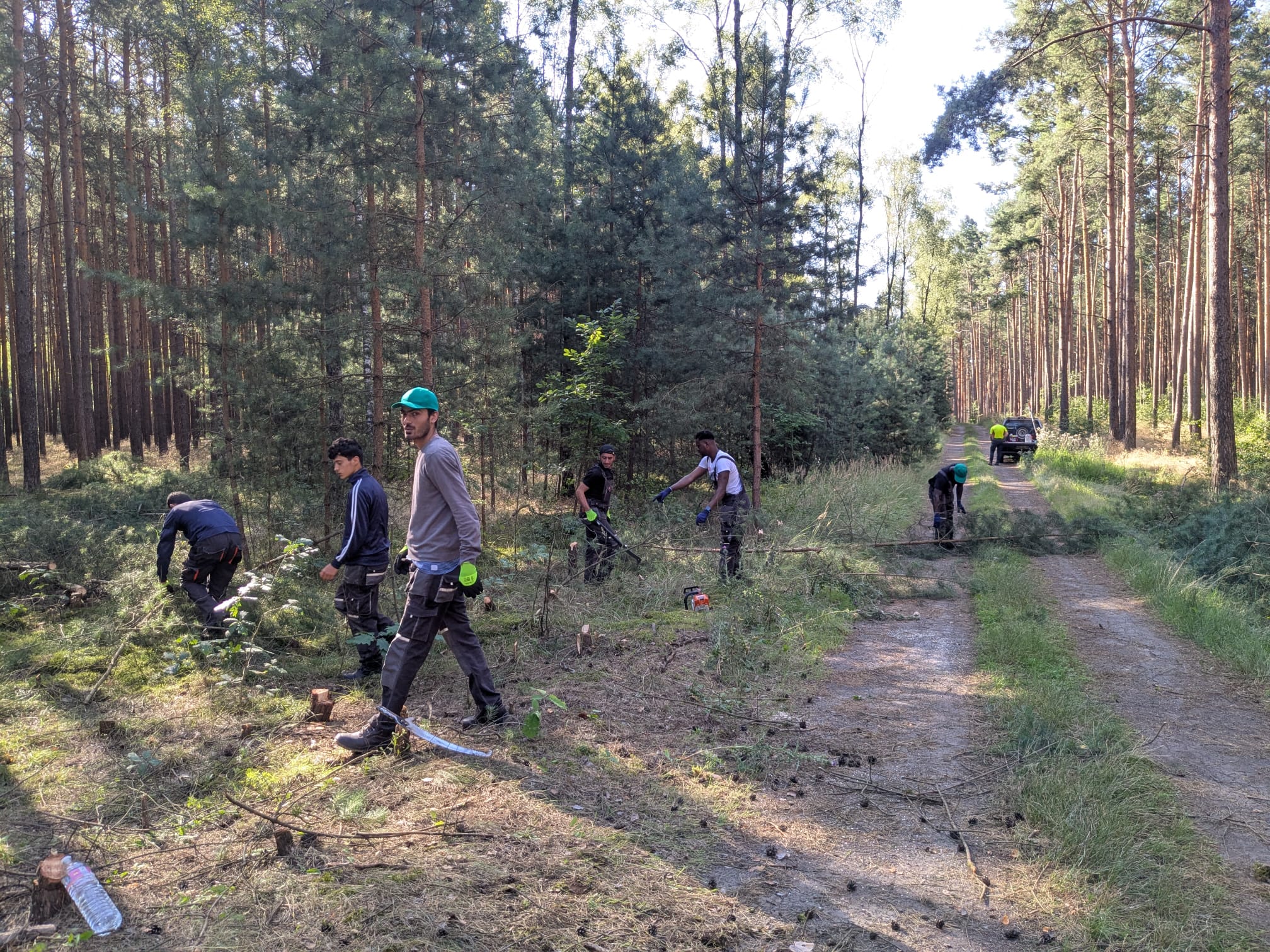 Durch eine Kooperation mit der Zentralen Ausländerbehörde – Außenstelle Eisenhüttenstadt leisten derzeit Helfer aus Syrien, Nigeria, Ghana und Somalia wertvolle Arbeit bei der Entfernung von Kiefernverjüngung auf unseren Waldbrandriegeln.