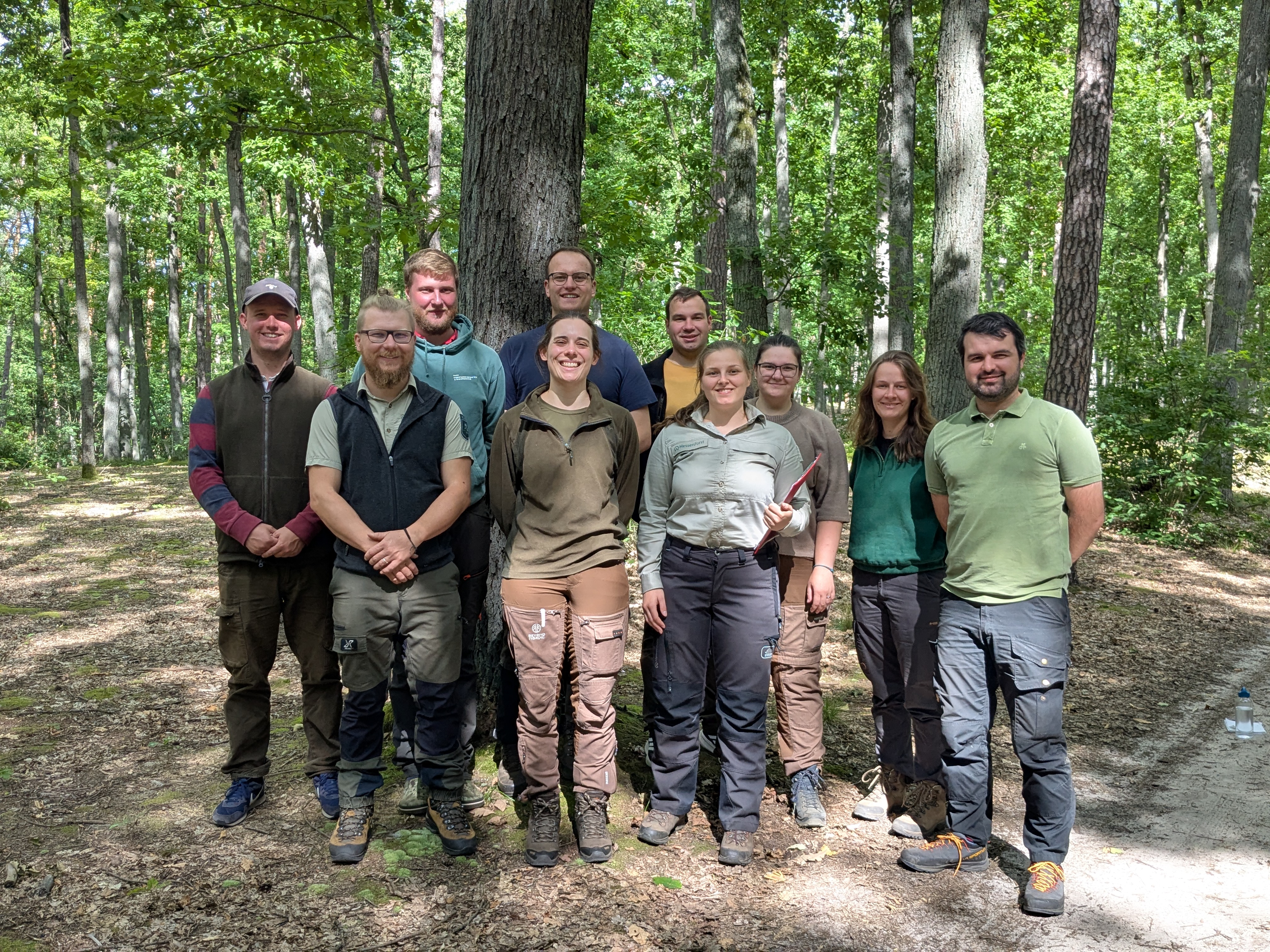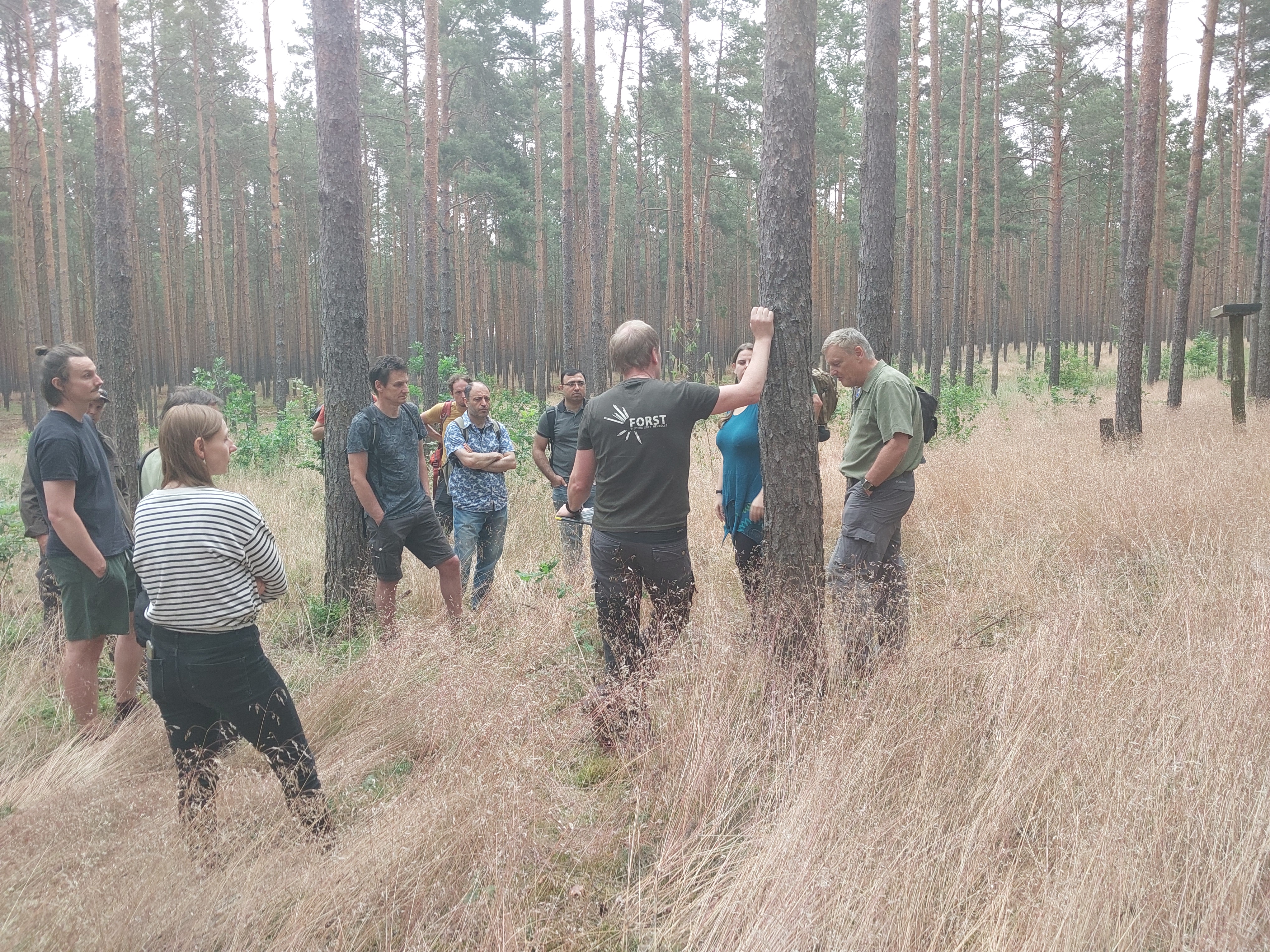 Die Forstbediensteten der Stiftung führten einen interessanten Austausch mit den Experten des Landeskompetenzzentrums Forst Eberswalde (LFE) - Fachbereich Waldökologie und Monitoring, um Prof. Dr. Ralf Kätzel im Forstrevier Callinenberg, insbesondere zur Baumartenwahl und Bestandesbehandlung auf